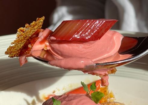 Rhubarb Mouse with Caramel biscuit