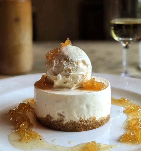 Honey cheesecake with stem ginger ice-cream