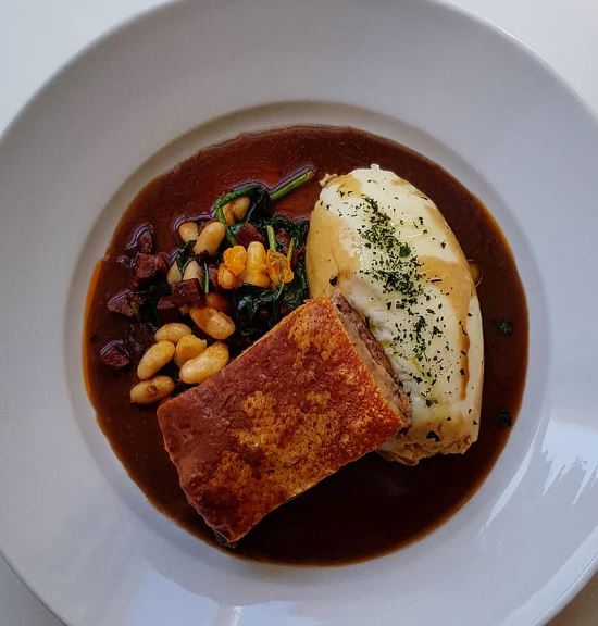 Pork belly with crispy crackling. Chorizo, spinach and cannellini beans, creamy mash.