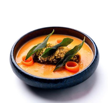 Carrot Velouté – Confit Pork Cheeks, Carrot Pickles and Sage Crumble