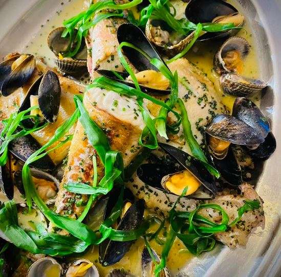 16 May OYSTER & FISH Ray wing, Red Gurnard, Lemon Sole, Fowey Mussels and Poole cockles. Garnished with hedgerow garlic. Facebook Twitter Pinterest LinkedIn Telegram