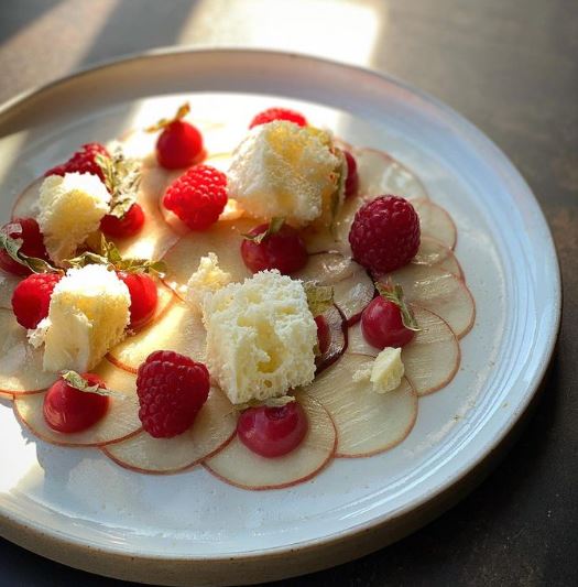 Carpaccio of white peaches brushed with lemon verbena syrup