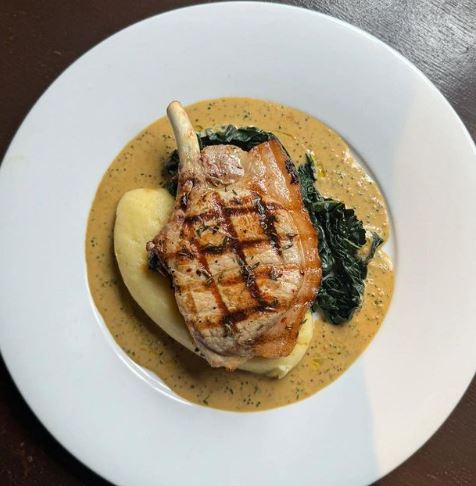 Grilled pork chop, mash, cavolo nero and mustard sauce