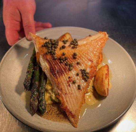 Fried Skate Wing Wild Garlic New Potatoes, Cheddar Creamed Leeks, Evesham Asparagus, Caper & Lemon Beurre Noisette