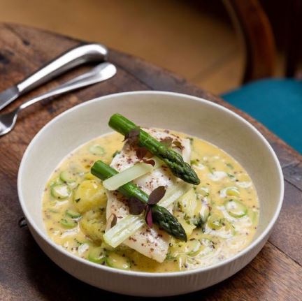 Poached halibut with asparagus, seakale, crushed Jersey Royal